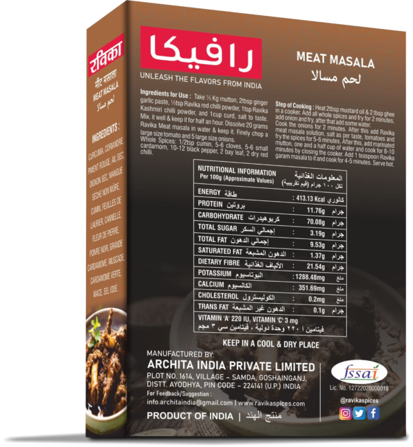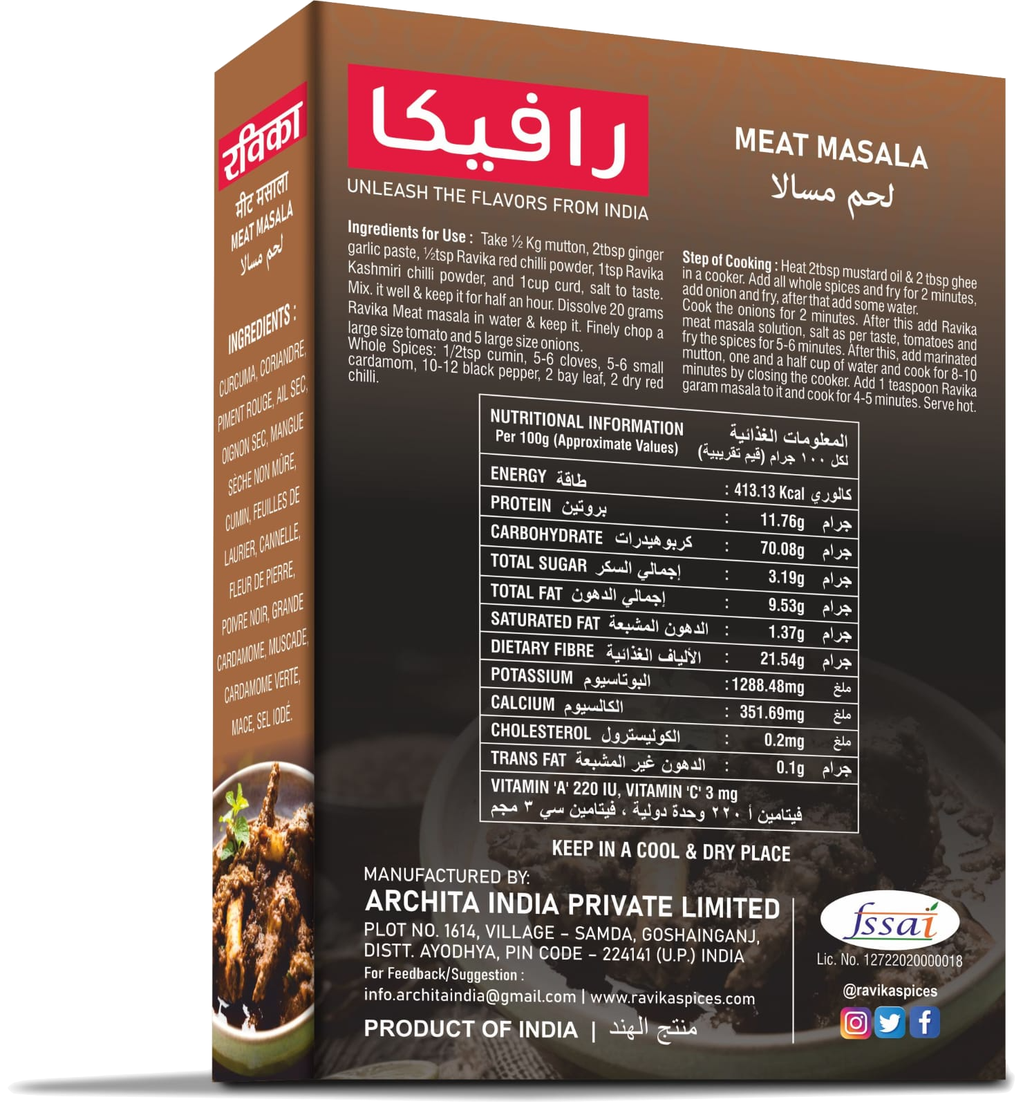 Meat Masala: A robust and aromatic spice blend specially crafted to enhance the flavor of meat dishes. This mix combines the richness of cumin, coriander, cloves, and other essential spices, creating a savory and spicy taste. Perfect for making traditional Indian meat curries, kebabs, and more, Meat Masala ensures an authentic and delicious experience.